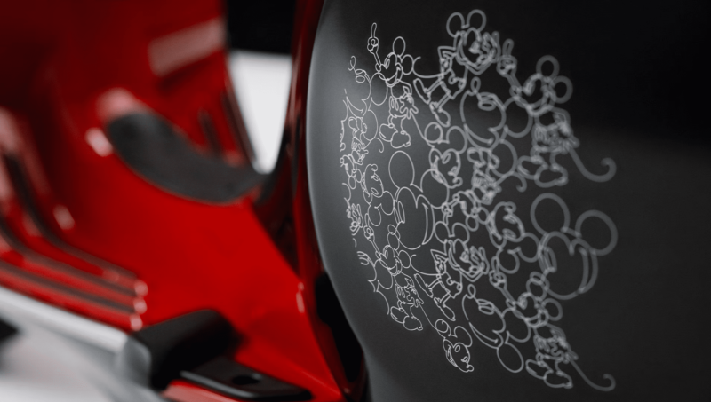 Pola siluet sang karakter menghiasi kedua sisi dan bagian depan kendaraan. Terakhir, tanda tangan Mickey Mouse di jok dan kerangka depan siap menarik perhatian, berikut gambarnya.